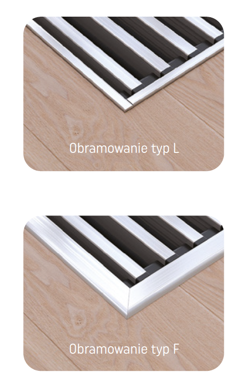 Verano posiada w swojej ofercie dwa rodzaje obramowania: L i F. Poniżej opis oraz różnice miedzy poszczególnymi obramowaniami. Innym kryterium wyboru obramowania jest materiał z którego wykonane jest obramowanie. Obramowanie dostępne jest także w wielu kolorach ale tylko przy wybraniu opcji z aluminium anodowanego. Kolory obramowań w anodzie są dostępne w takich samych kolorach co kratki z aluminium anodowanego.