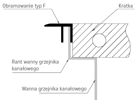 Obramowanie typ F posiada grubszą ramkę, która nachodzi delikatnie na podłogę.Obramowanie tego typu zalecane jest w przypadku tzw. podłogi pływającej. Podłoga pływająca to podłoga, która nie jest jak sama nazwa wskazuje na stale połączona z podłożem lecz jest tylko na niej swobodnie ułożona. Podłogą pływającą jest np. podłoga z paneli lub drewnianych desek. Podłoga pływająca musi mieć między ścianą jak i wanną grzejnika delikatną szczelinę delatacyjną, która ochroni podłogę przed ewentualnym uszkodzeniem. Obramowaniem typu F można także zasłonić ewentualne źle i nieprecyzyjne obrobienie podłogi wokół grzejnika.