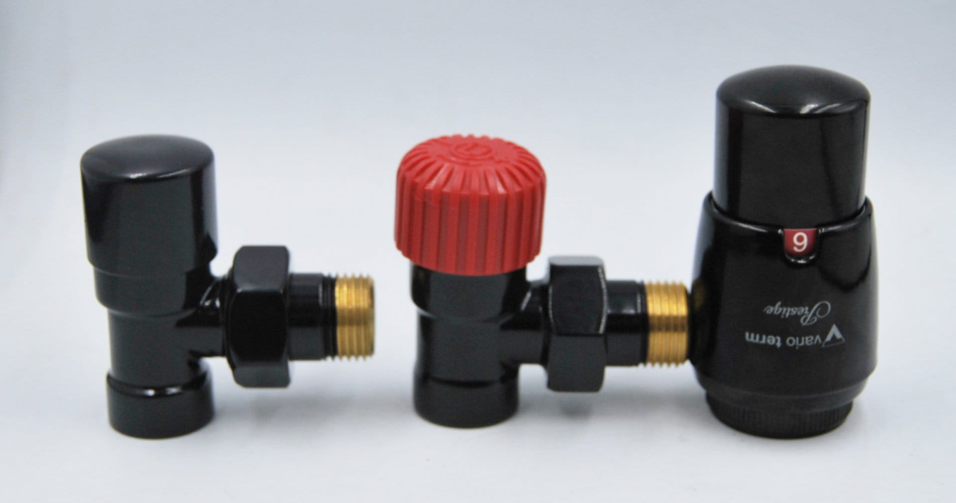 Komplet zaworów w wersji kątowej z głowicą termostatyczną oraz złączkami w kolorze czarnym matowym