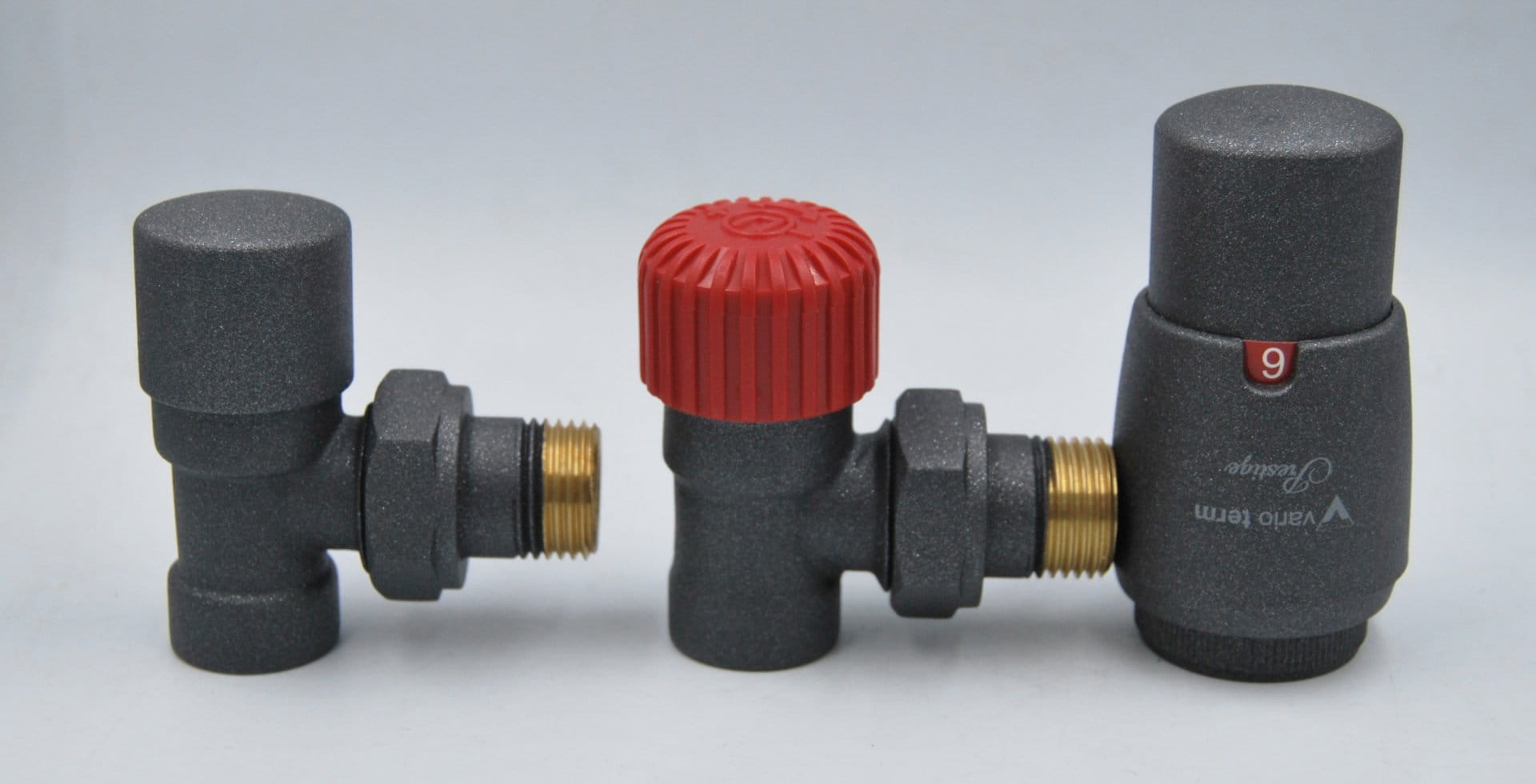 Komplet zaworów w wersji kątowej z głowicą termostatyczną oraz złączkami w kolorze grafitowym strukturalnym