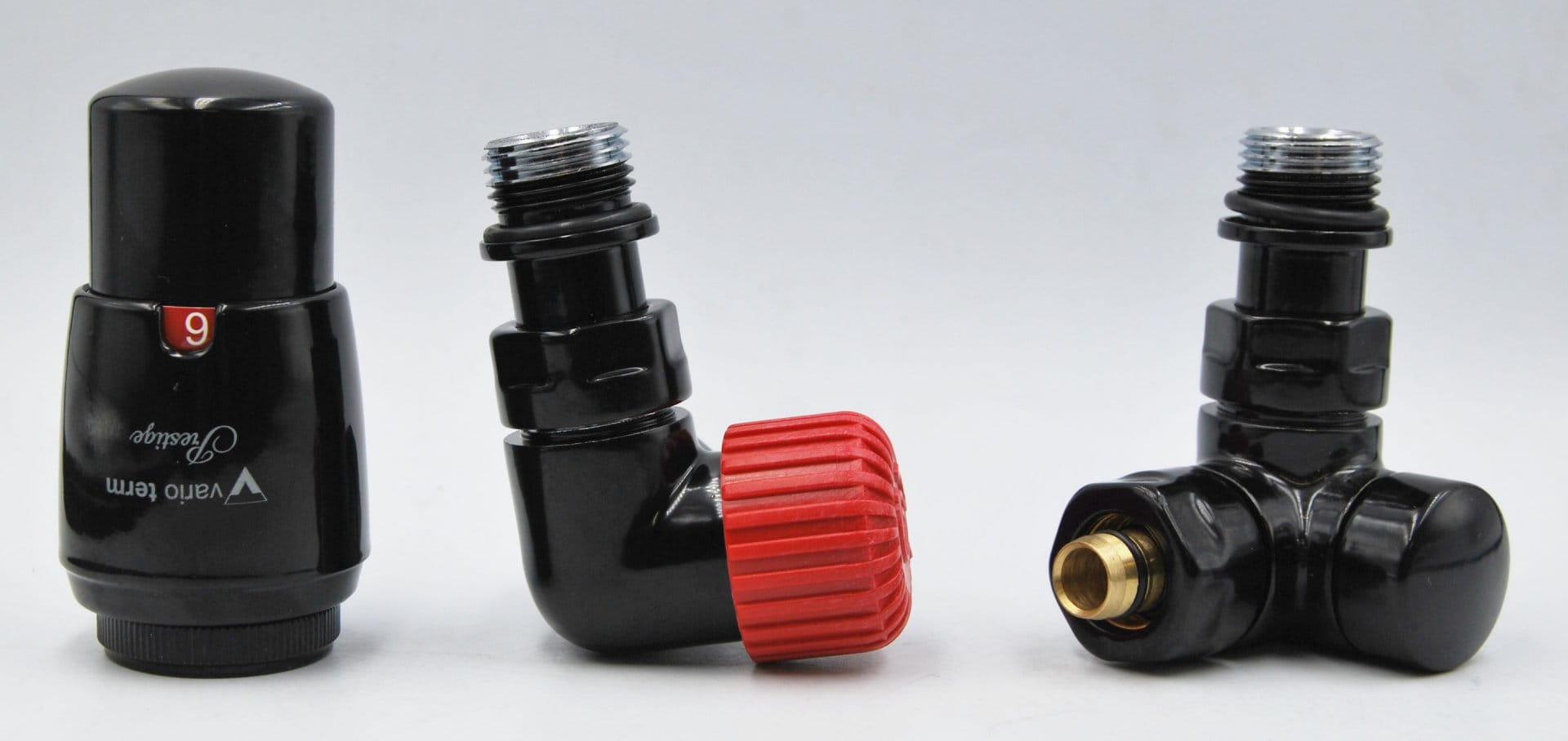 Komplet zaworów w wersji osiowej z głowicą termostatyczną w kolorze czarnym matowym