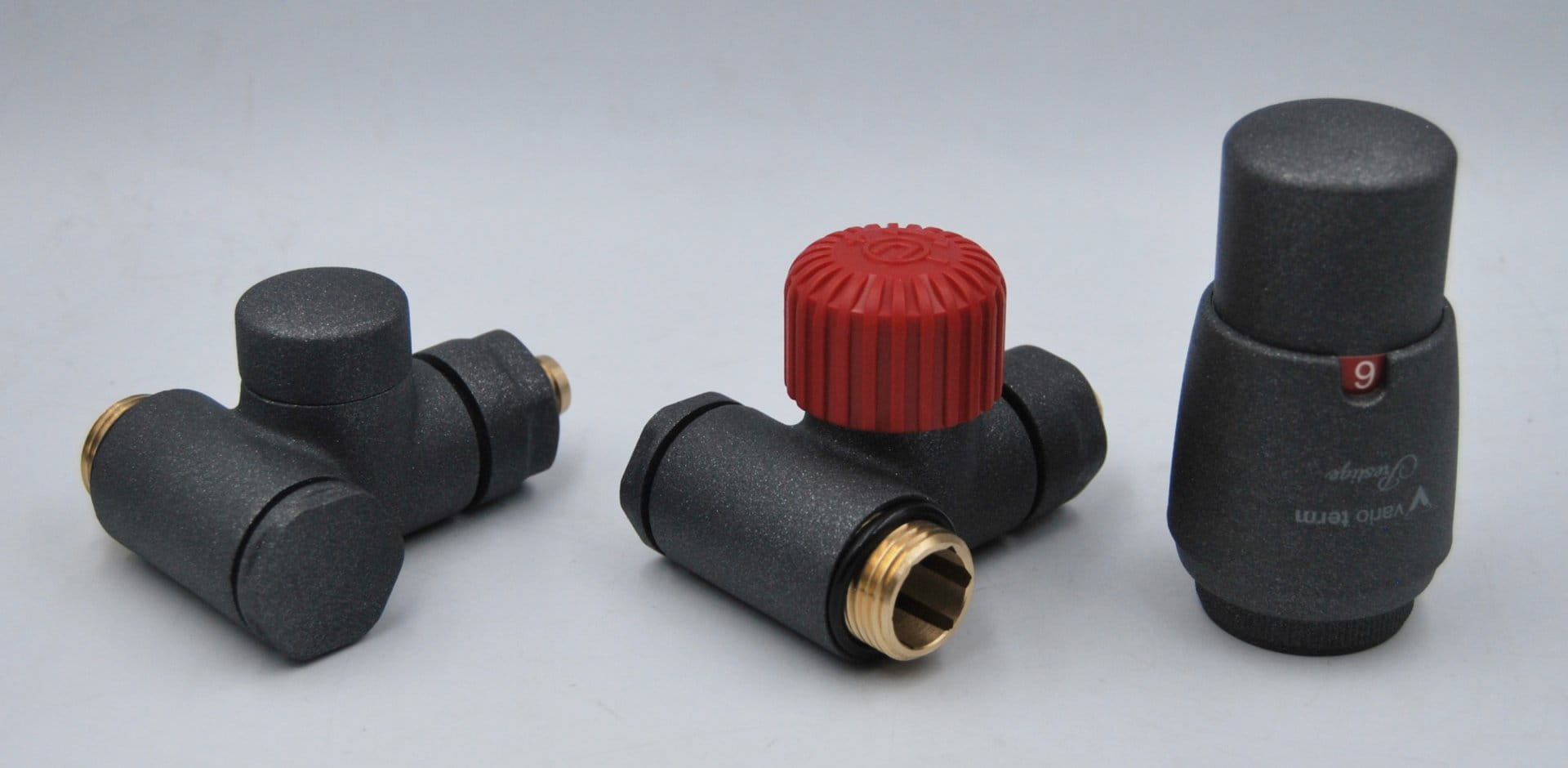 Zestaw zaworów osiowych do grzejników łazienkowych z trójnikiem do montażu grzałki elektrycznej w kolorze grafitowym strukturalnym